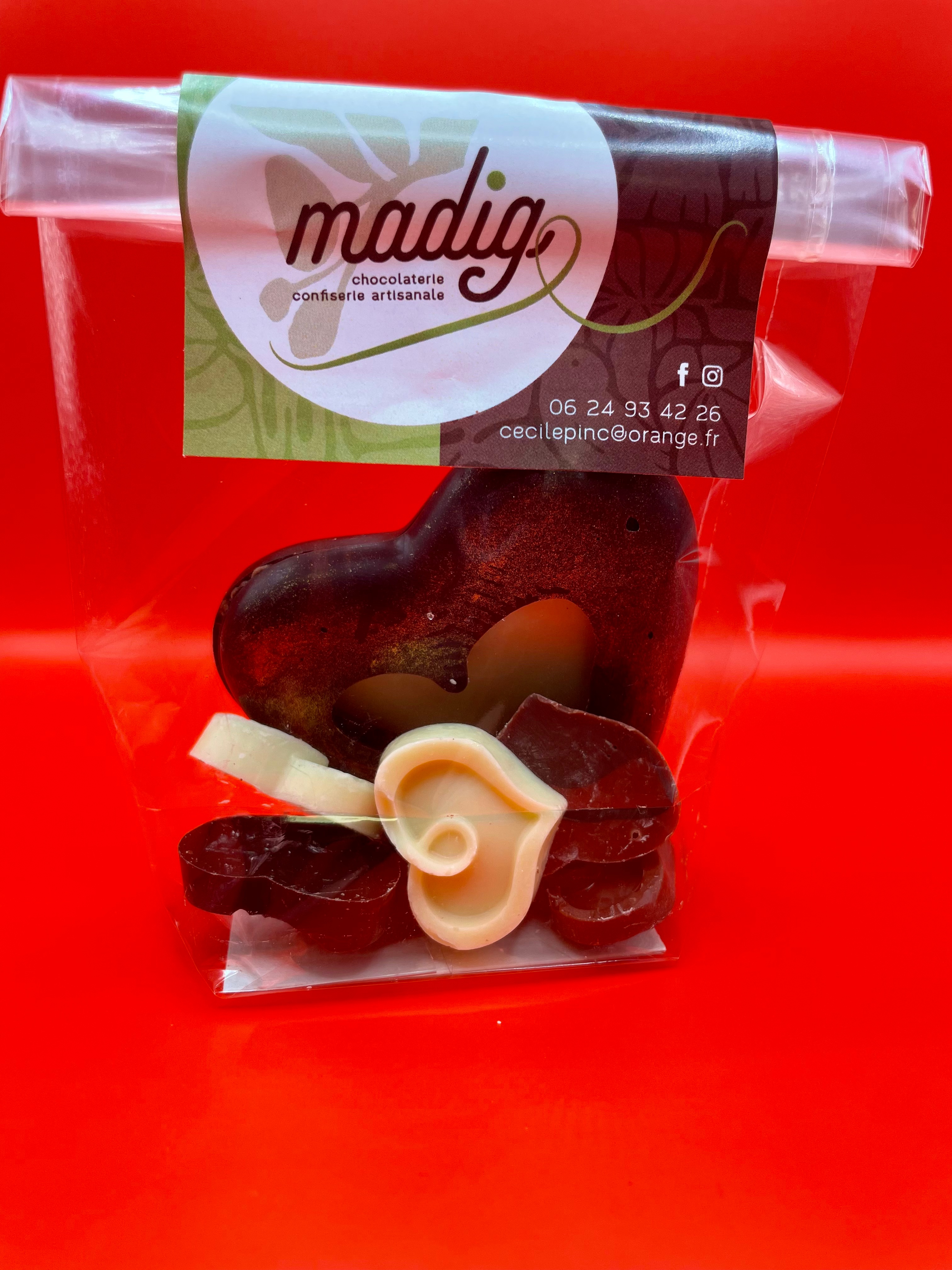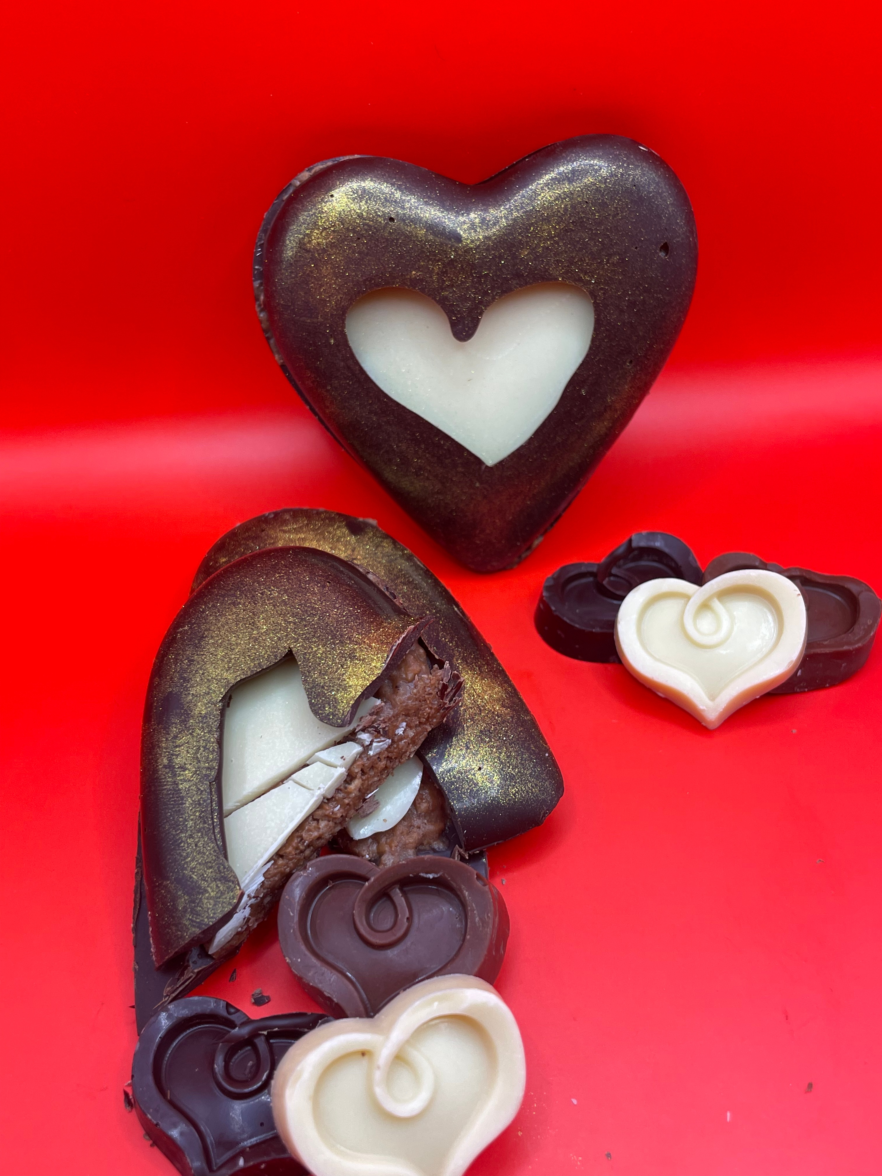 Cœur ajouré en chocolat noir et blanc, garni de praliné feuilletine. C’est craquant, vous craquez ?