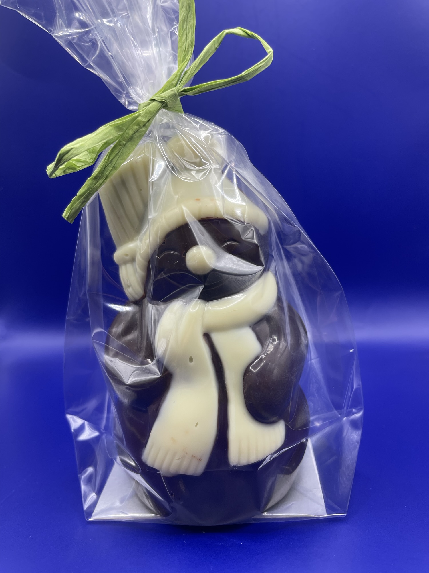 Bonhomme de neige en chocolat noir (70% cacao) ou en chocolat au lait (40% cacao), décoré de chocolat blanc (34% cacao), garni de fritures.